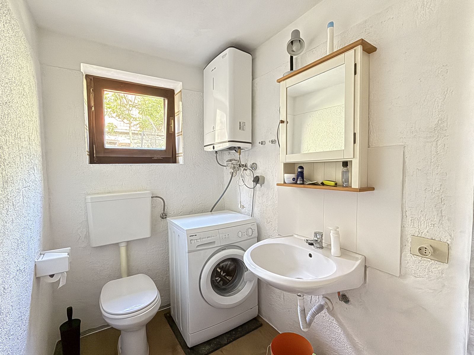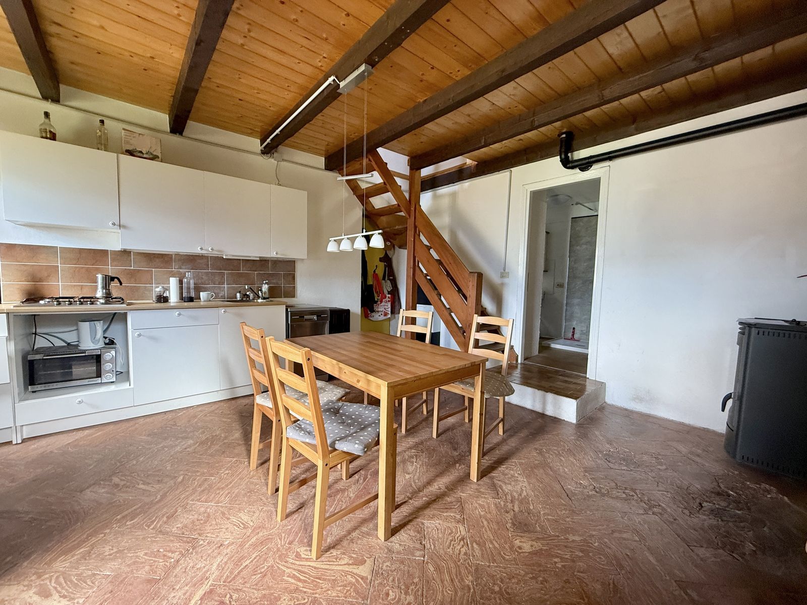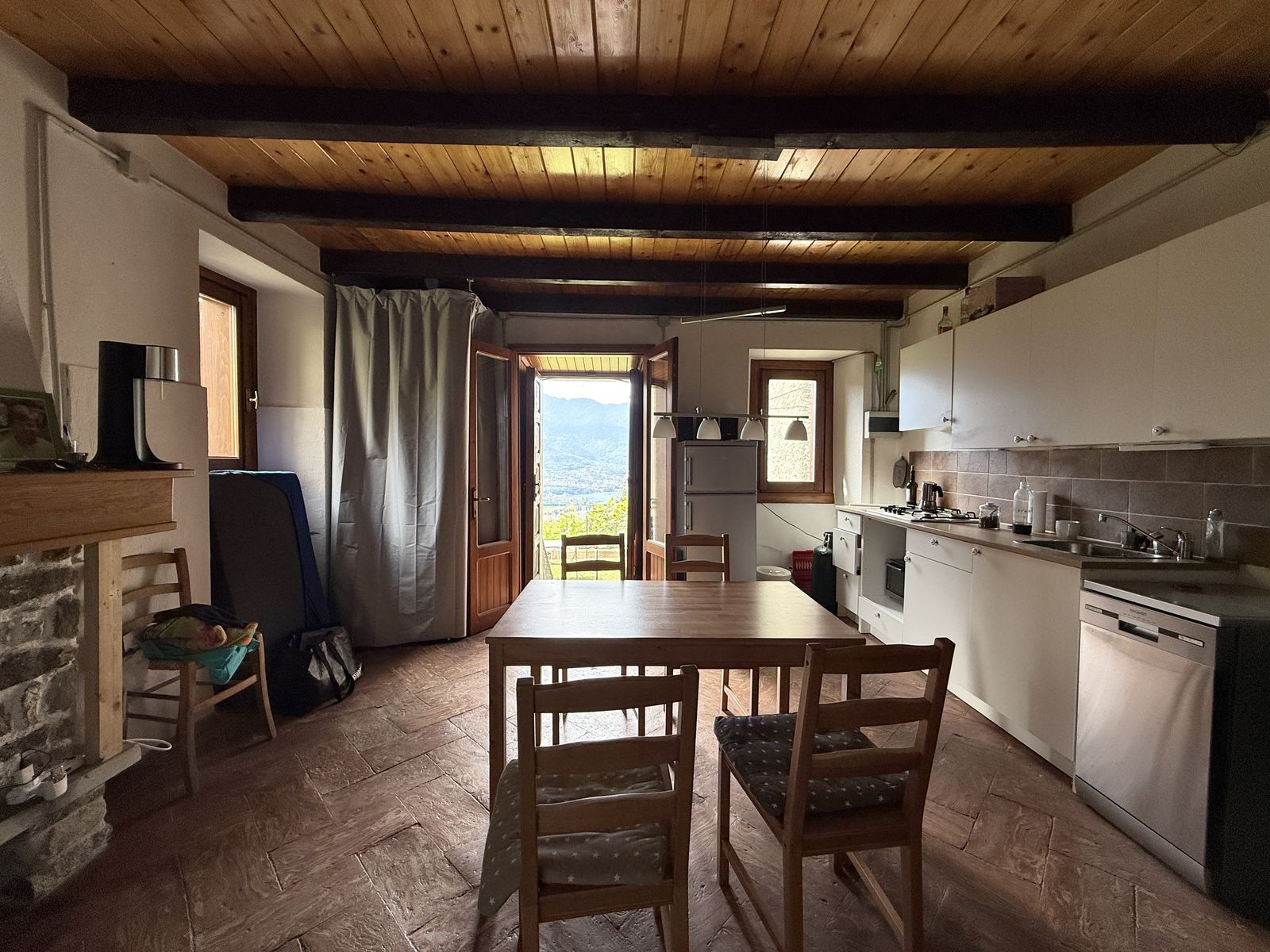 Im Hochparterre liegt der Wohnbereich mit einer gemütlichen Küche (mit lombardischem Terrakottaboden), einem Holzofen und einem Fensterbad mit Dusche.