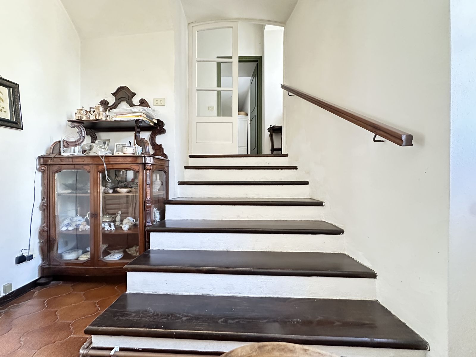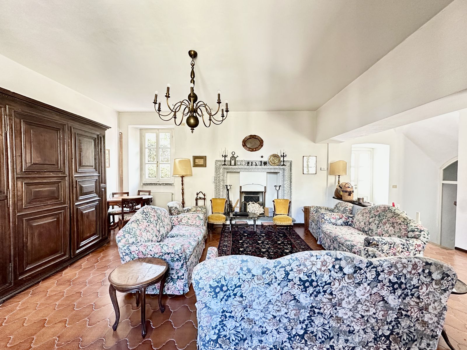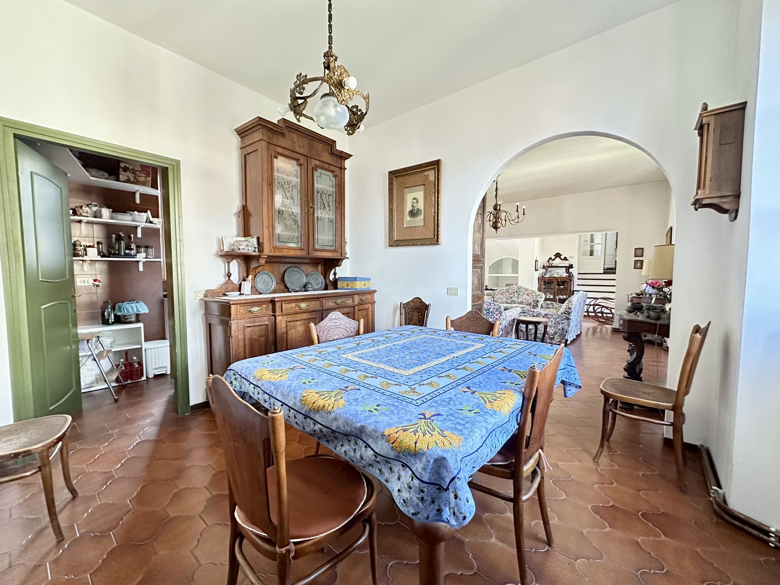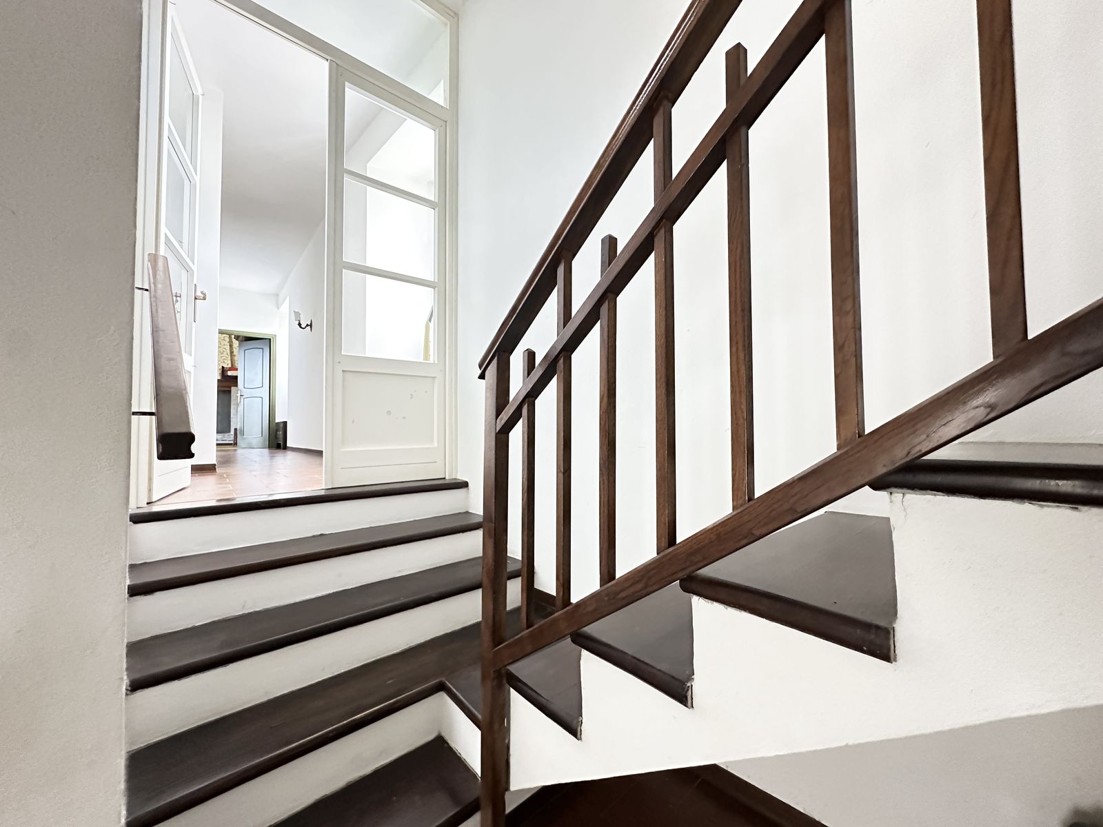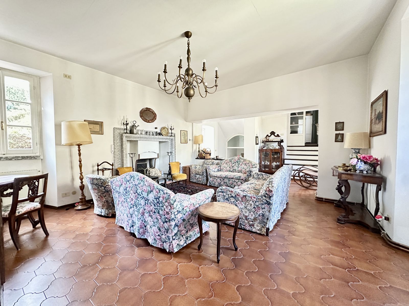Erstes Obergeschoss – Helles Wohnzimmer mit originalem Steinkamin, Esszimmer, separate Küche, drei Doppelzimmer und zwei Badezimmer. Von hier aus gelangt man in den wunderschönen Privatgarten von ca. 250 qm – eine grüne Oase im Herzen des historischen Zentrums, ideal für Mahlzeiten im Freien und entspannte Stunden.