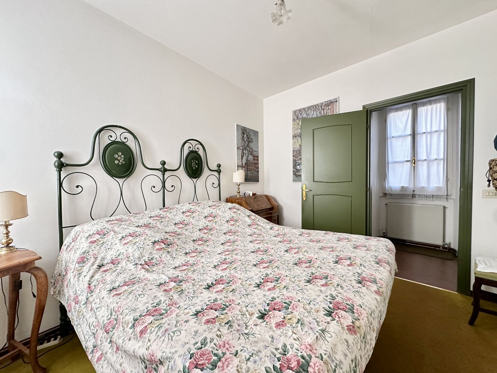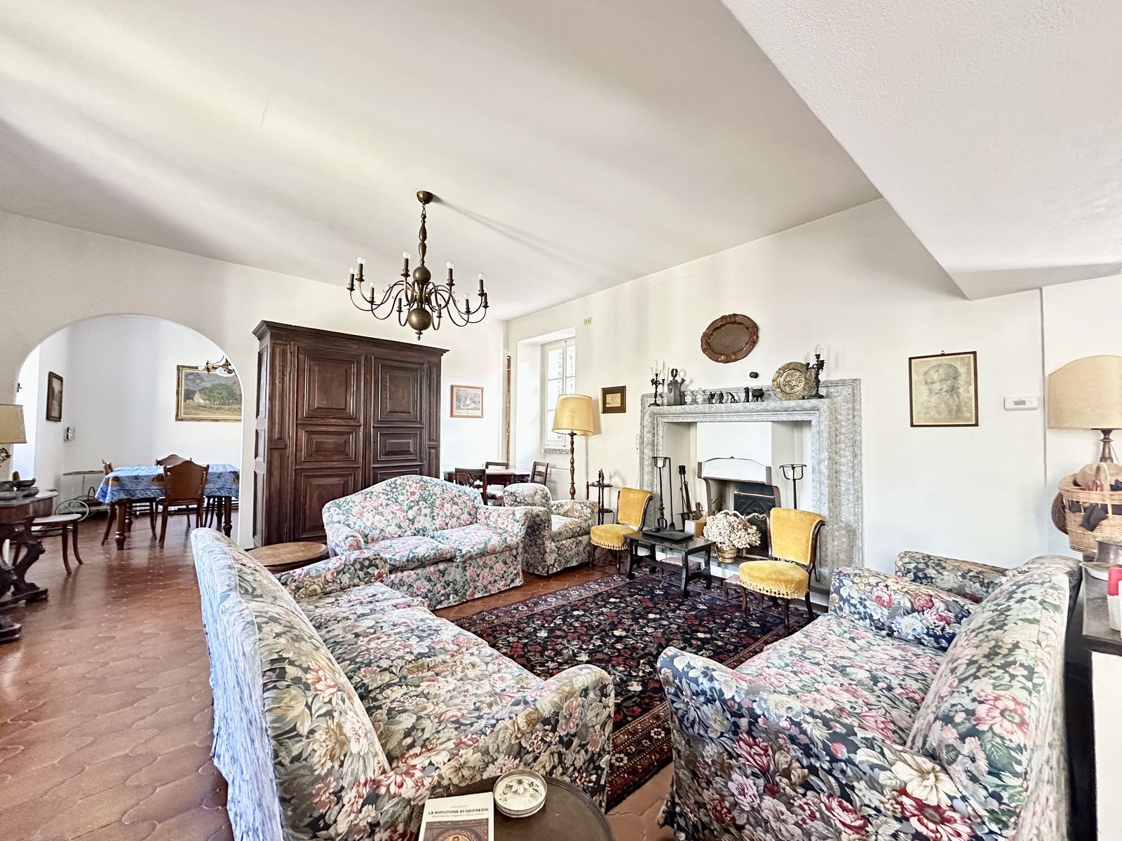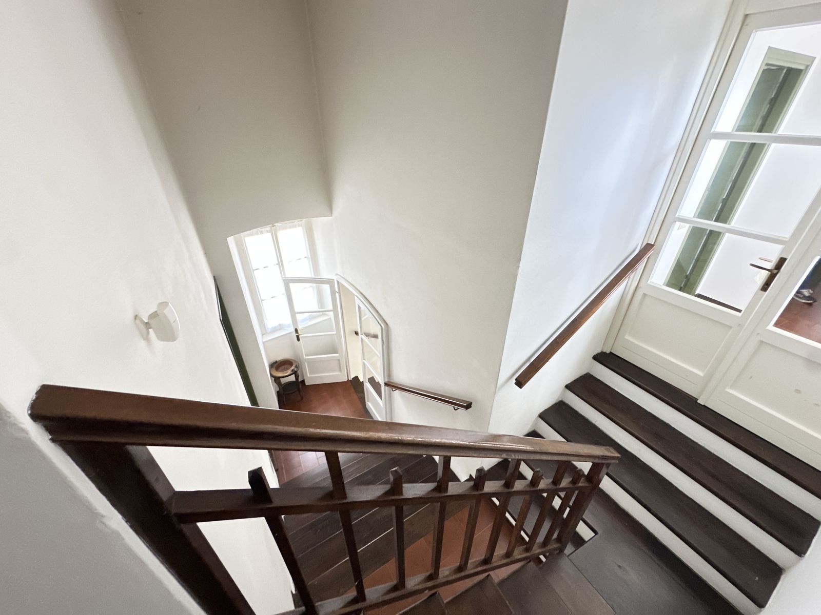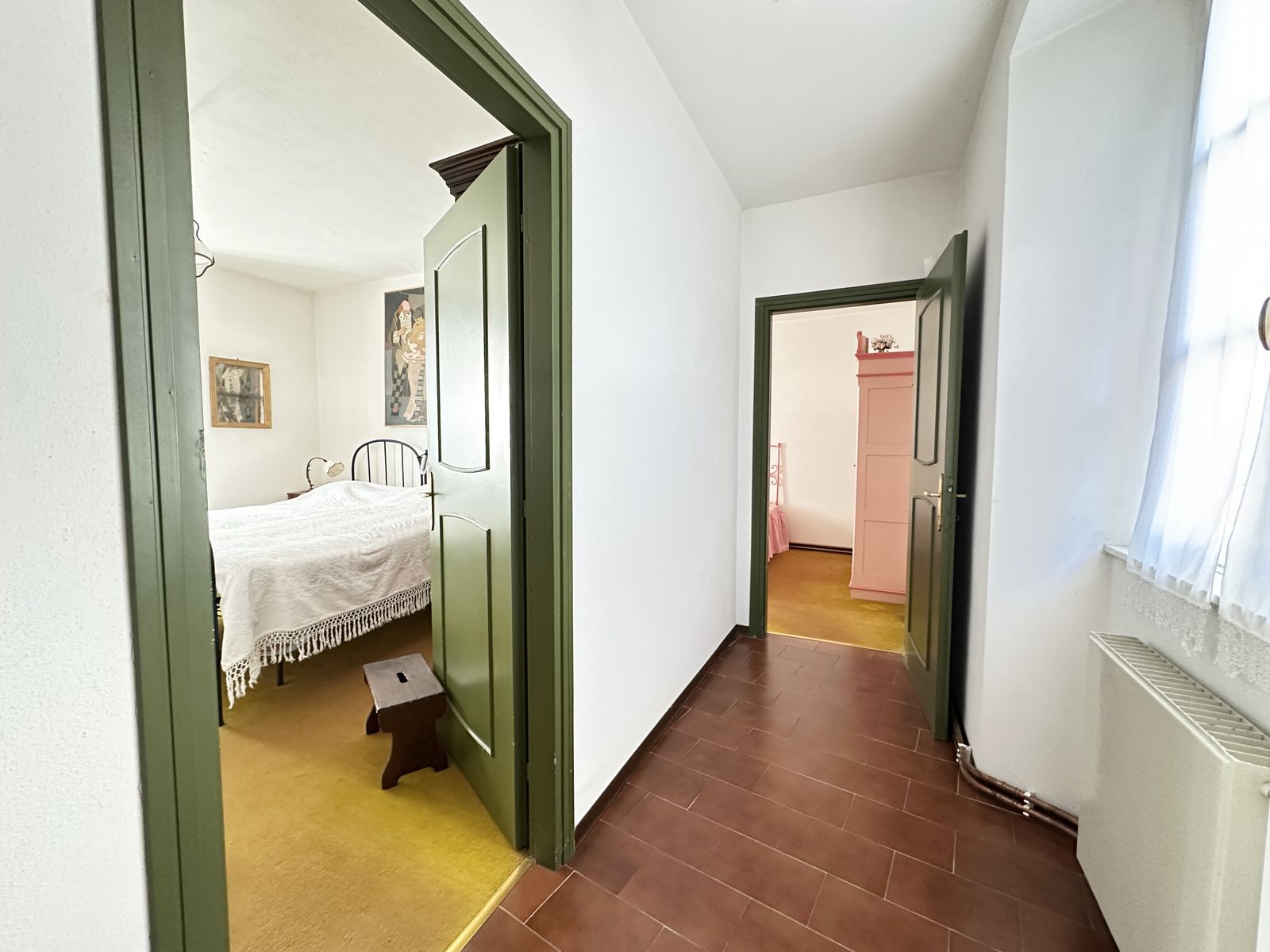 Erstes Obergeschoss – Helles Wohnzimmer mit originalem Steinkamin, Esszimmer, separate Küche, drei Doppelzimmer und zwei Badezimmer. Von hier aus gelangt man in den wunderschönen Privatgarten von ca. 250 qm – eine grüne Oase im Herzen des historischen Zentrums, ideal für Mahlzeiten im Freien und entspannte Stunden.