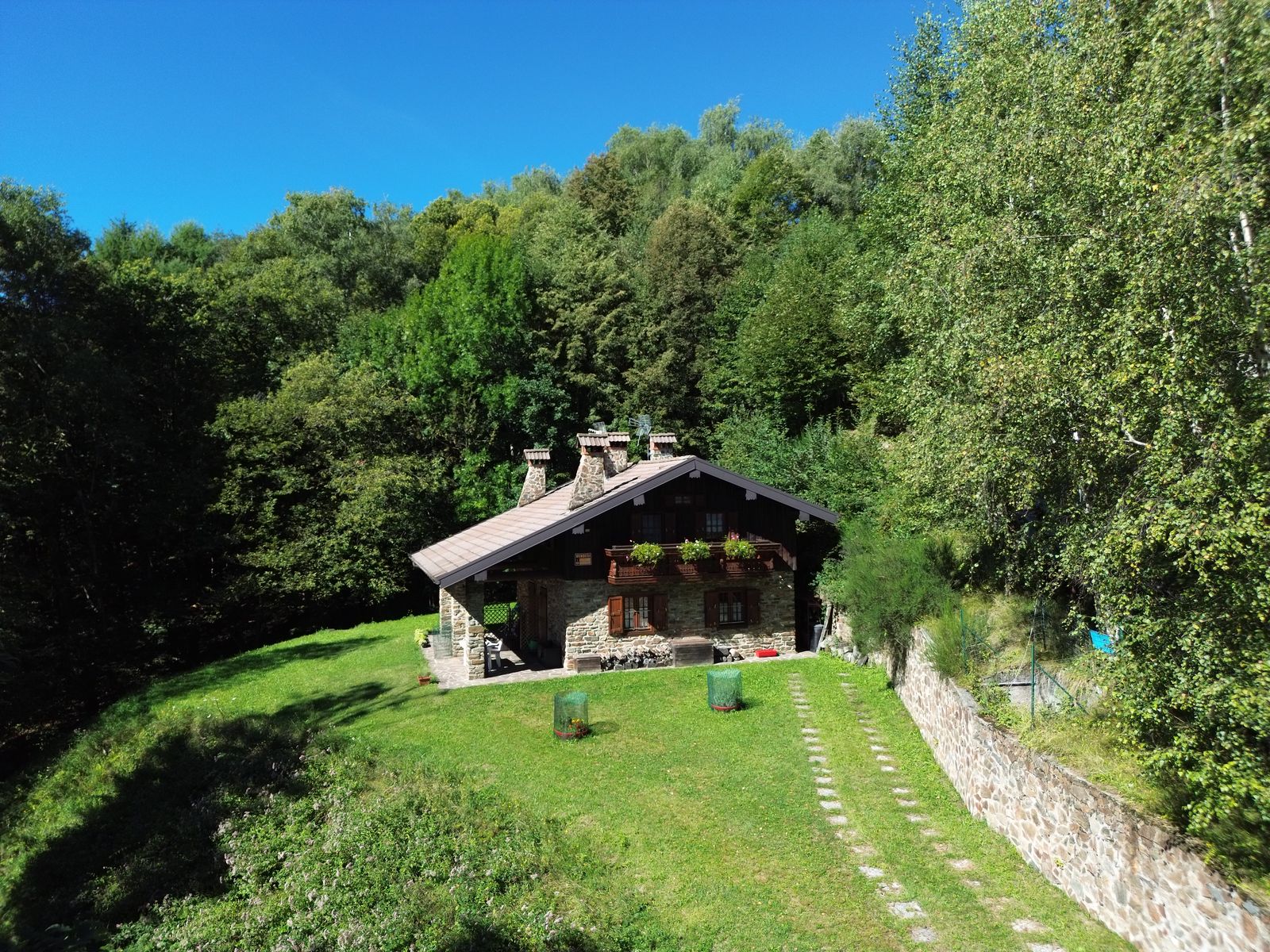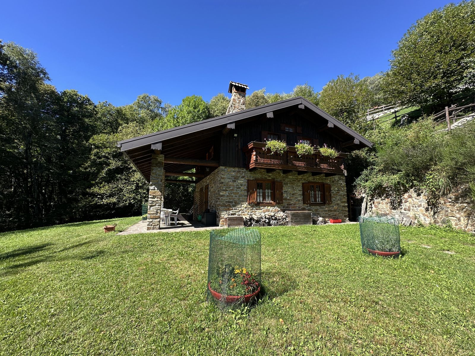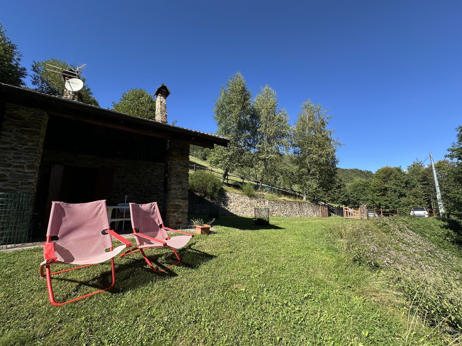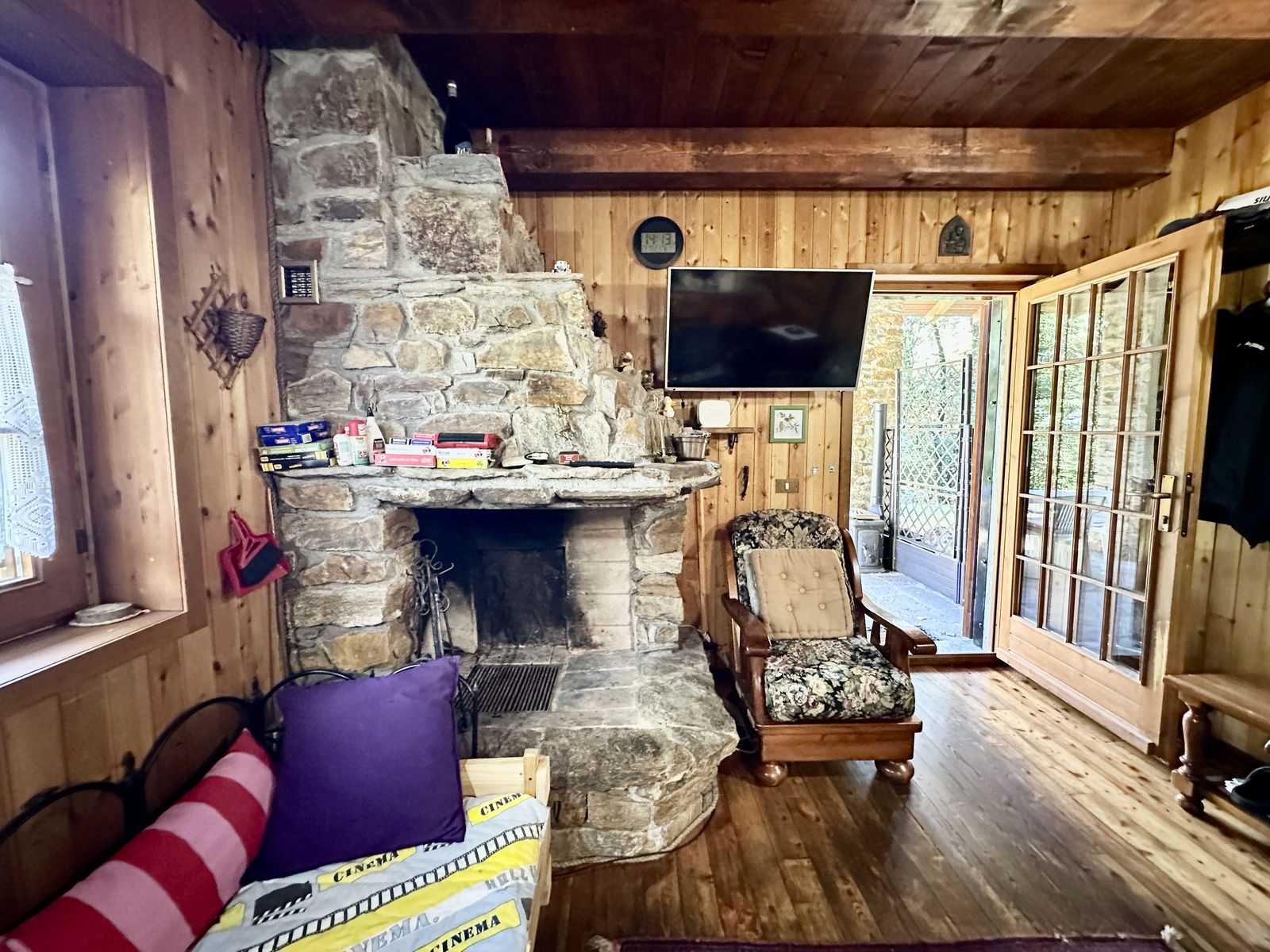 Unabhängiger Teil einer Berghütte auf drei Seiten frei, in Holz und Stein gebaut, mit umliegendem Gemeinschaftsgarten.