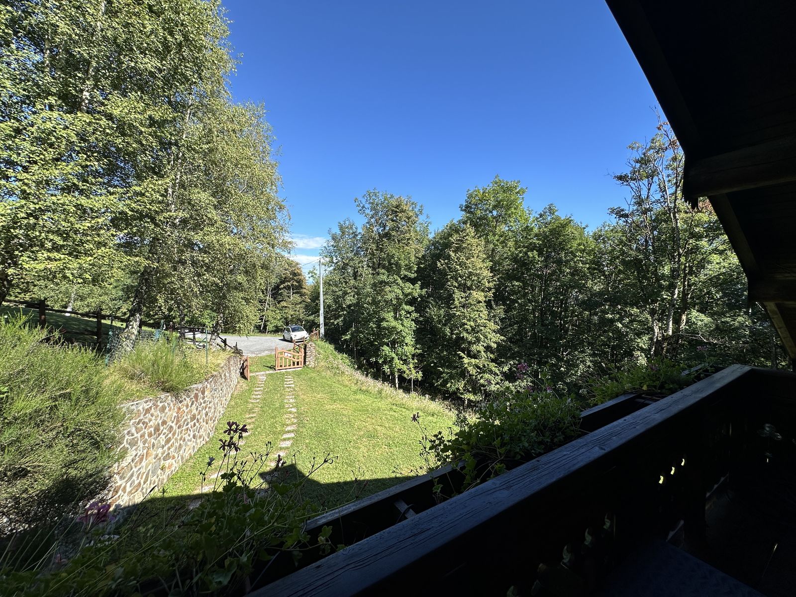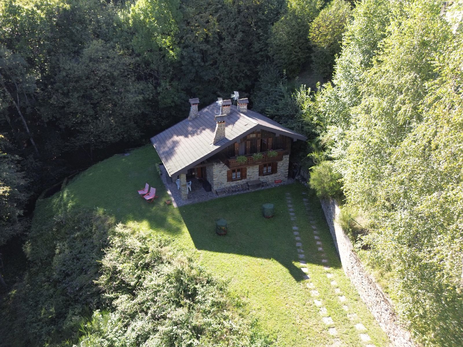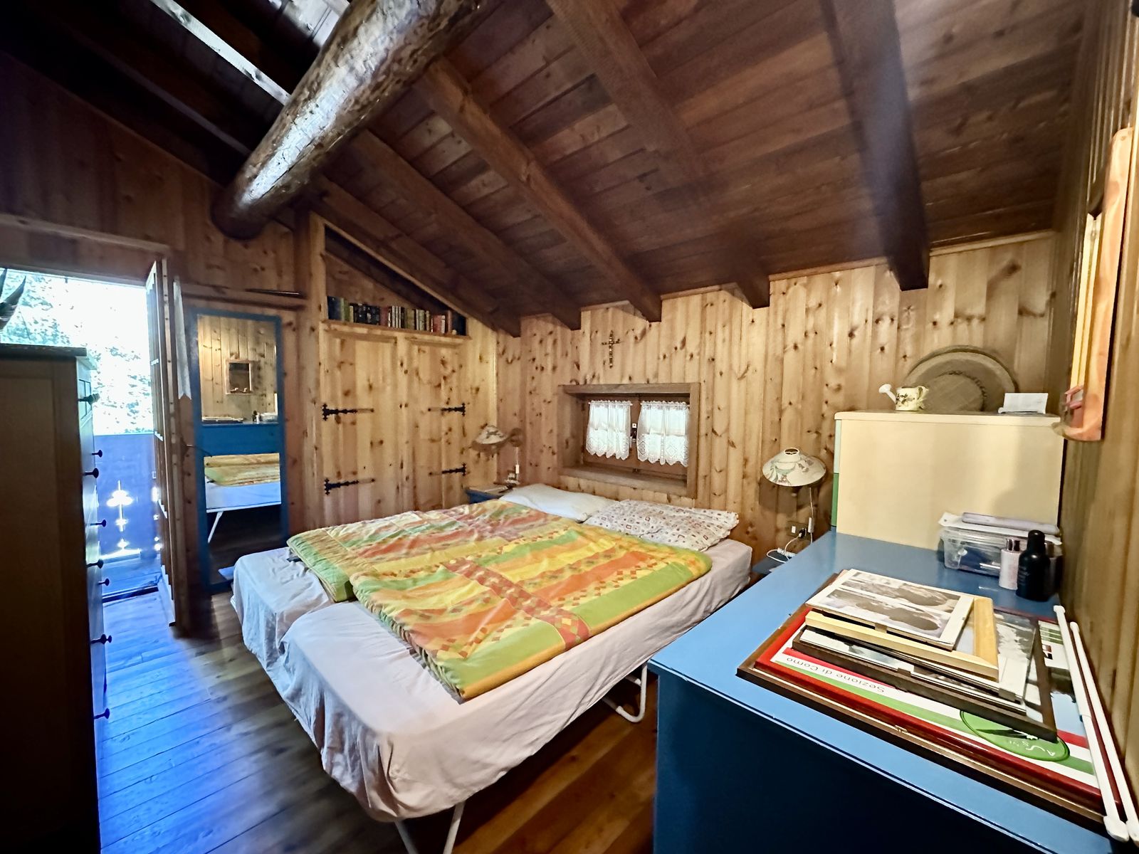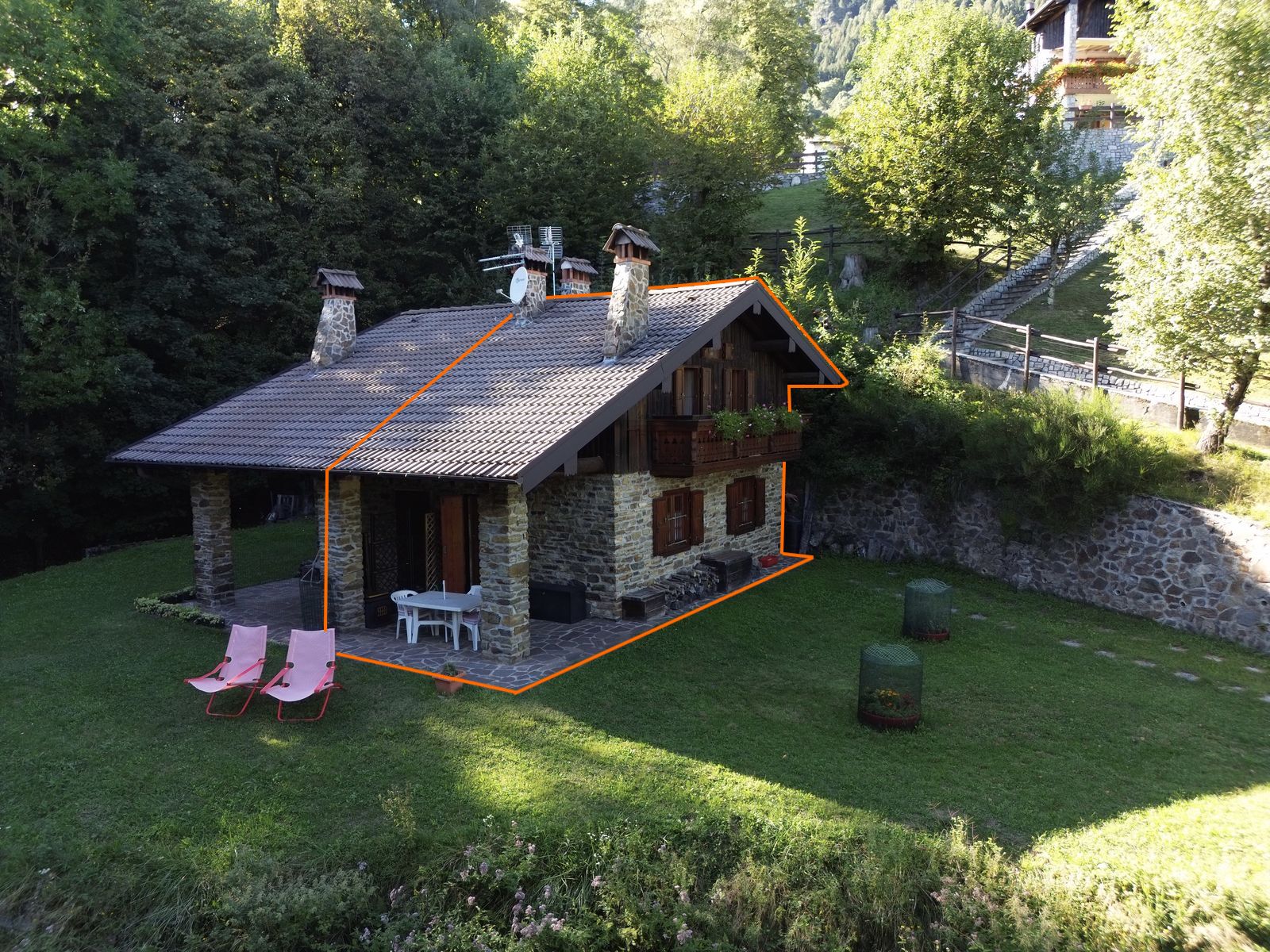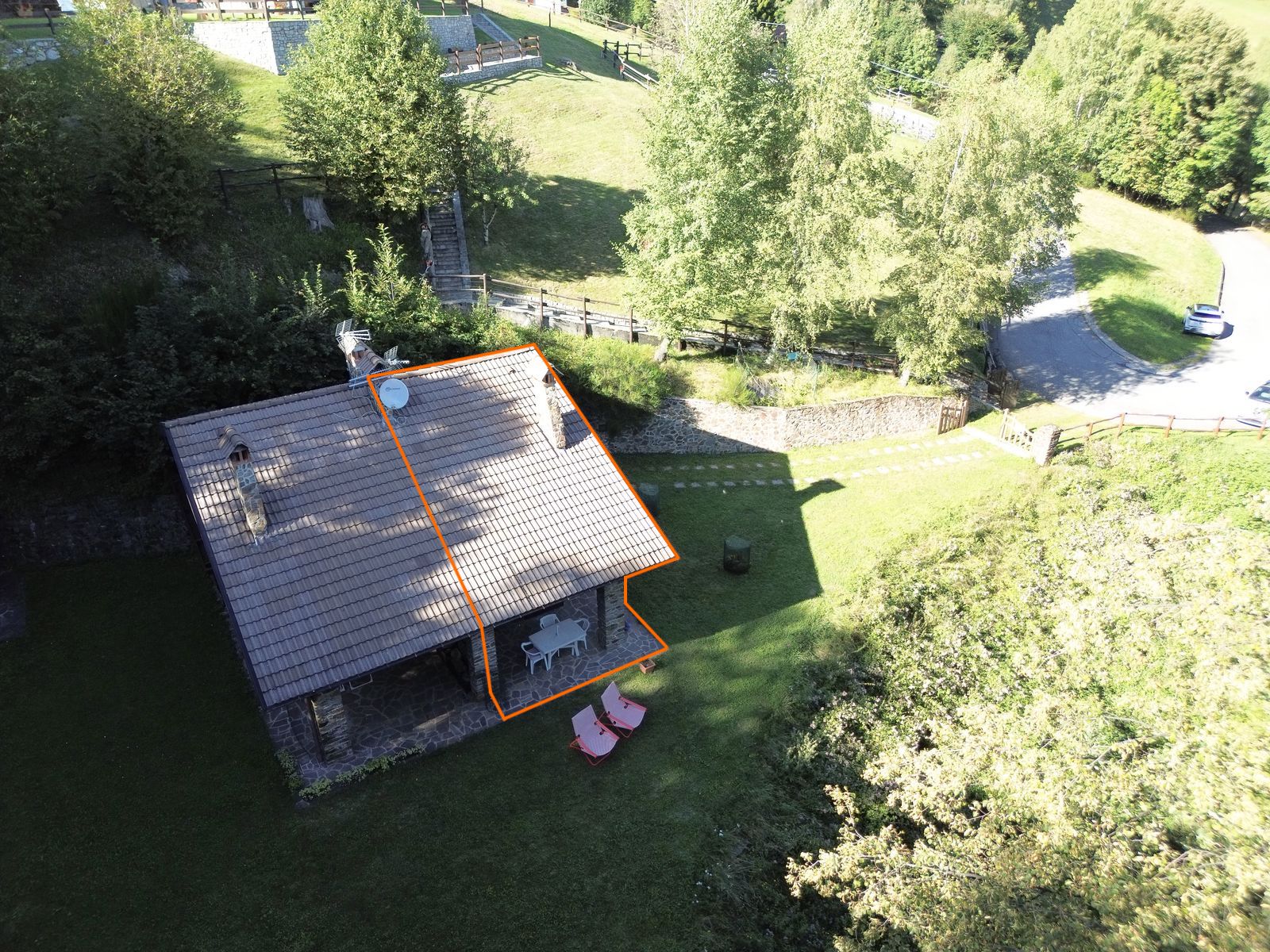 Unabhängiger Teil einer Berghütte auf drei Seiten frei, in Holz und Stein gebaut, mit umliegendem Gemeinschaftsgarten.