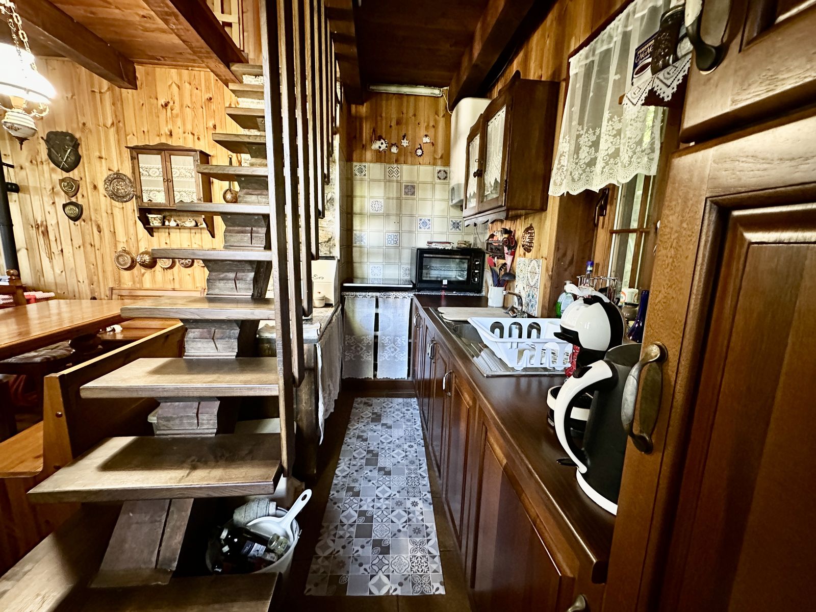 Im Erdgeschoss: ein gemütlicher Wohnbereich mit Steinkamin und Küchenecke, mit direktem Zugang zur überdachten Veranda (12 m²) und zum Garten – ideal für Mahlzeiten im Freien und entspannte Momente.