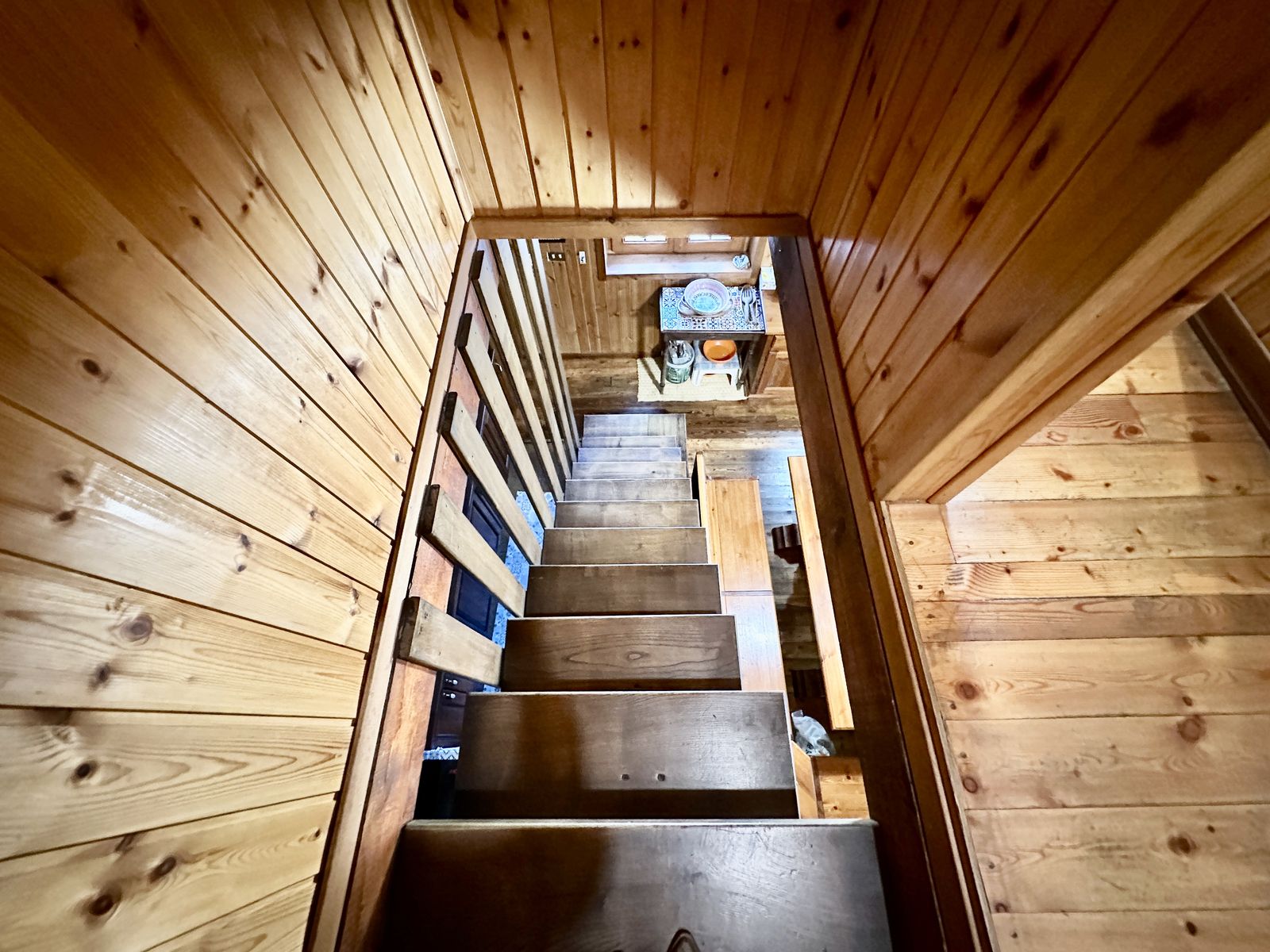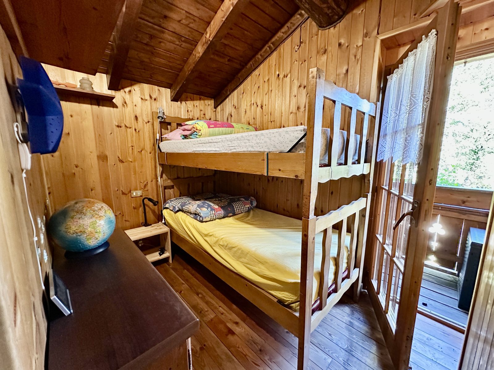 Im Obergeschoss mit sichtbaren Holzbalken befinden sich zwei Schlafzimmer (ein Doppelzimmer und ein Einzelzimmer mit Etagenbett) sowie ein Badezimmer mit Fenster. Beide Schlafzimmer haben Zugang zum Panoramabalkon mit Blick auf die umliegende Natur.