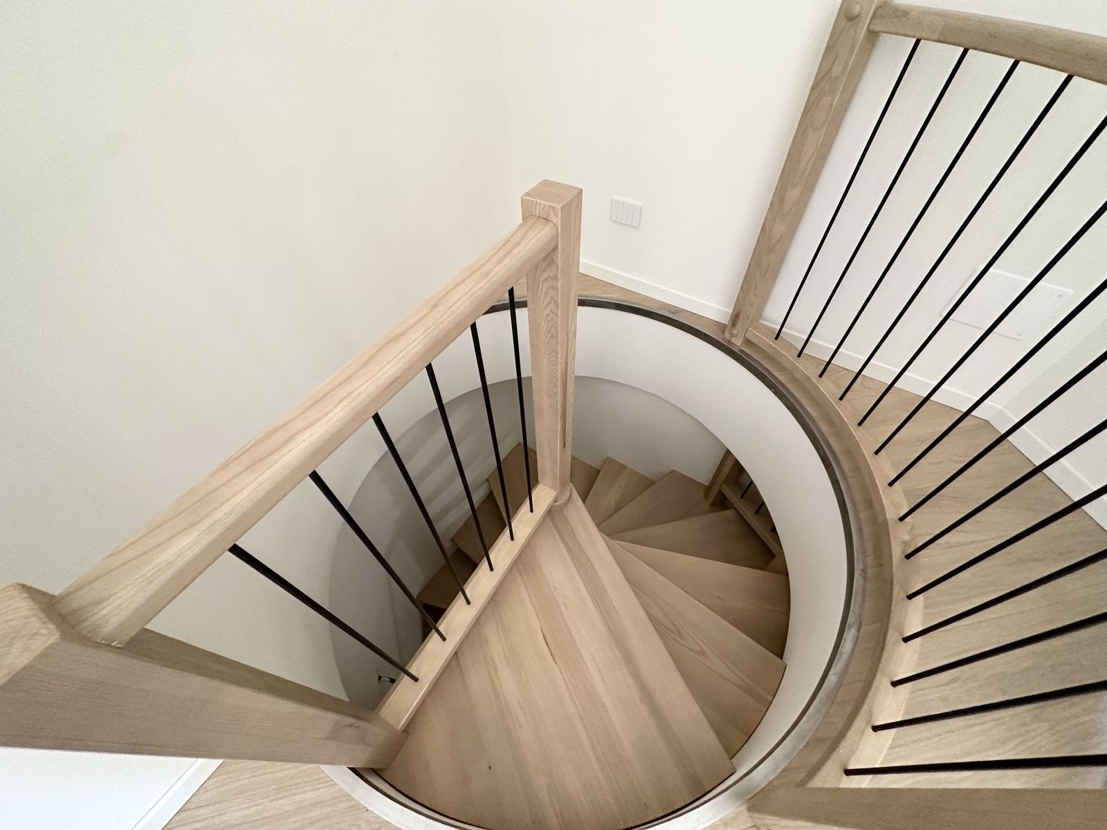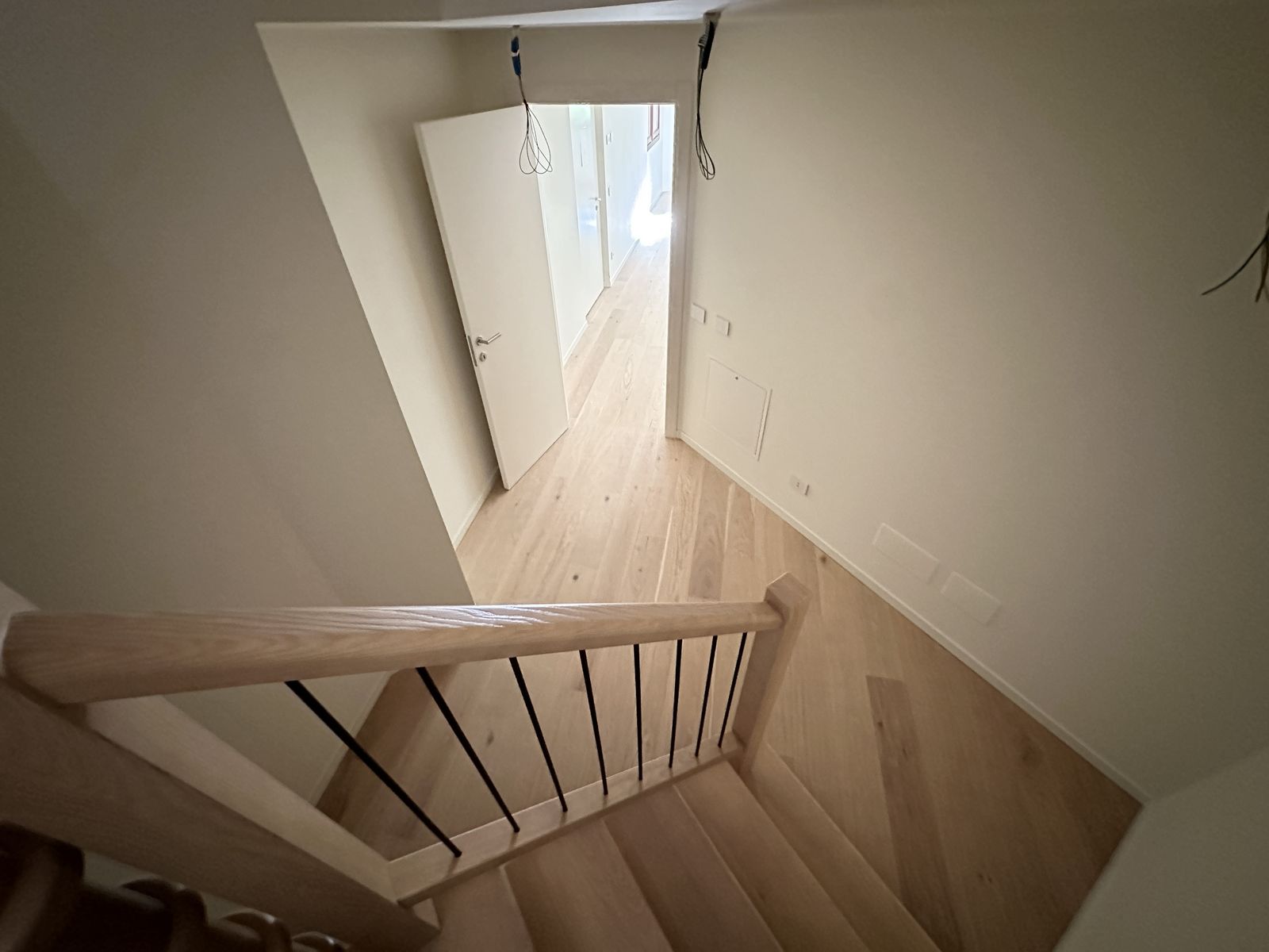 Zugang über eine elegante Holztreppe vom Wohnzimmer