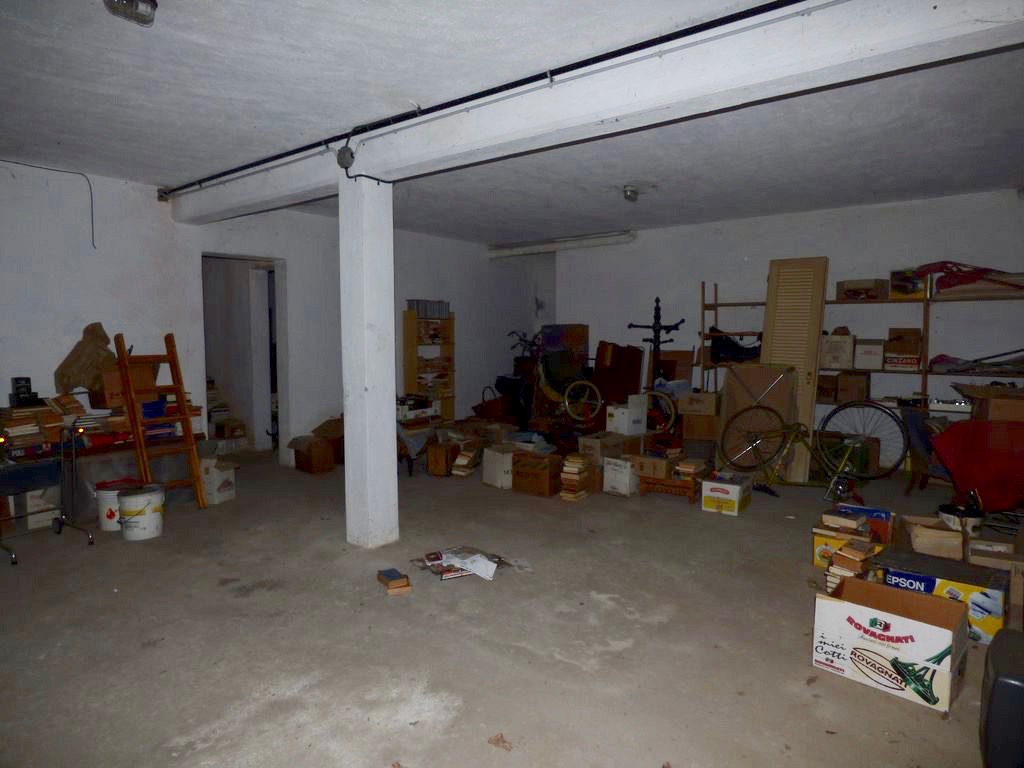 Große Garage von ca. 40 m² (vollständig oberirdisch, auch ideal zur Umwandlung in eine Taverne auf Gartenebene), zwei großzügige Abstellräume sowie Heizraum mit Ölheizung.