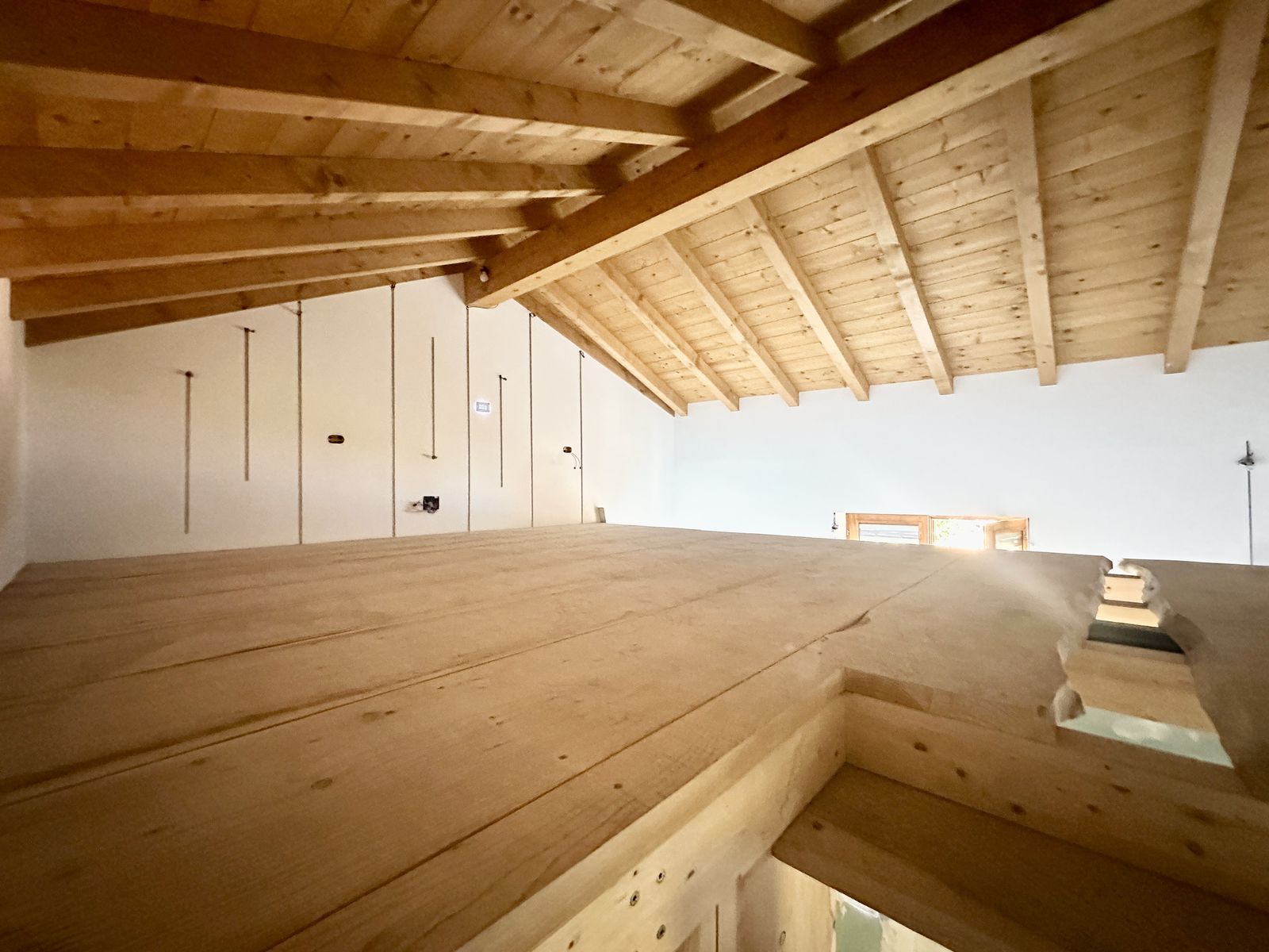 Über eine Holztreppe gelangt man in die Galerieebene (ca. 17 m²) mit sichtbaren Holzbalken, die sich ideal als stilvoller Schlafbereich eignet.