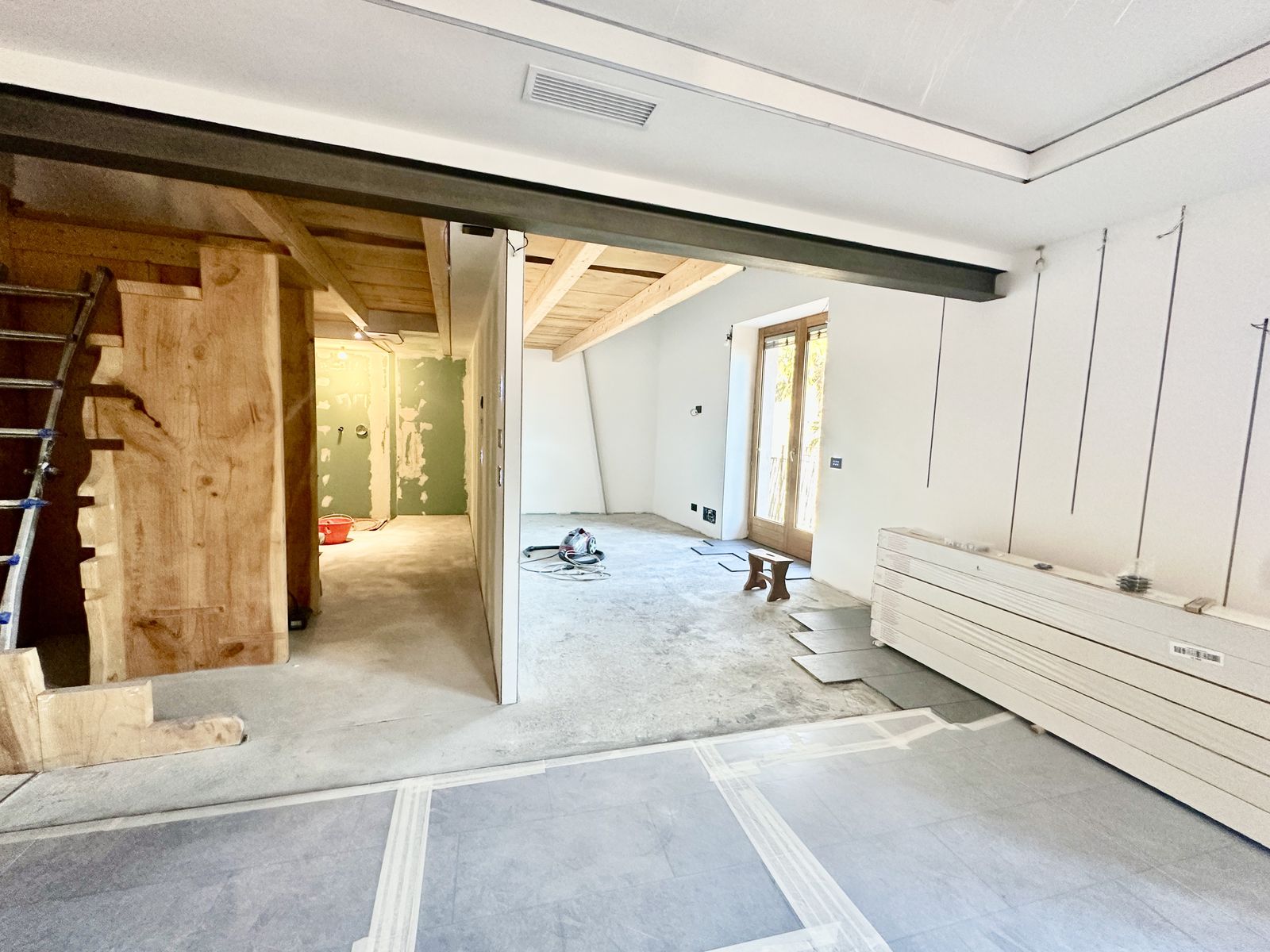 Auf dieser Ebene befindet sich außerdem ein großzügiges Badezimmer mit bodengleicher Dusche, veredelt mit eleganten Schieferdetails, die der Wohnung eine besondere und hochwertige Note verleihen.