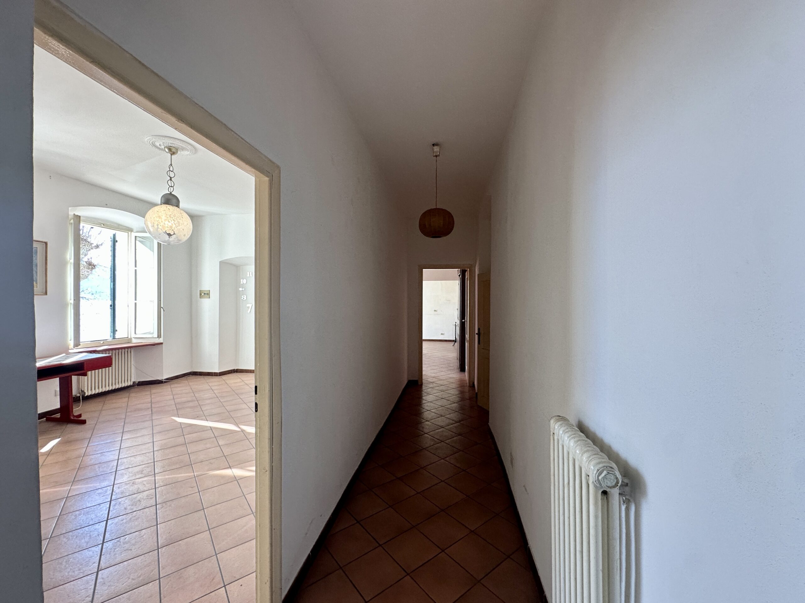 Über die charmante interne Steintreppe erreicht man das erste Obergeschoss, wo sich die Wohnung auf einer Ebene erstreckt. Eine großzügige und helle Eingangshalle erschließt die Räume: