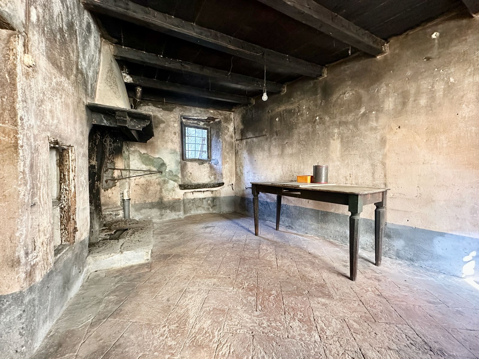 Im ersten Obergeschoss liegt eine großzügige Wohnküche mit Kamin, die direkten Zugang zur Terrasse bietet. Ergänzt wird diese Etage durch einen Abstellraum sowie einen Holzlagerraum mit Kamin und originalem lombardischem Terrakottaboden, der den authentischen Charakter der Immobilie unterstreicht.